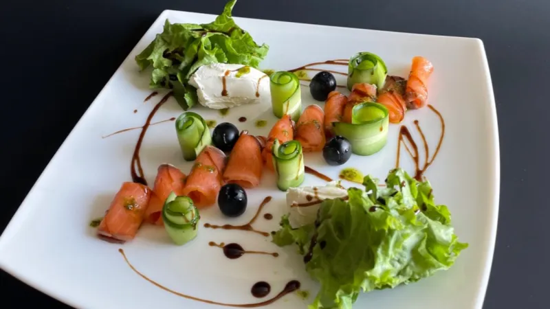 Сёмга слабосолёная, огурцы, сыр Cremette, листья салата, маслины, соус песто, бальзамический крем