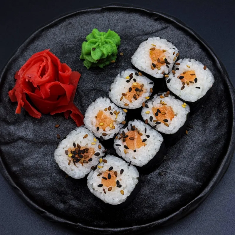 Запеченный ролл с лососем (8 шт. порция)– нежный лосось в сочетании с пикантным спайси-соусом, запеченный до идеальной текстуры. Обсыпан ароматным черным и белым кунжутом, создавая насыщенный вкус и хрустящую корочку. Идеальный выбор для любителей пряных акцентов. Подается с соевым соусом, васаби и маринованным имбирем.