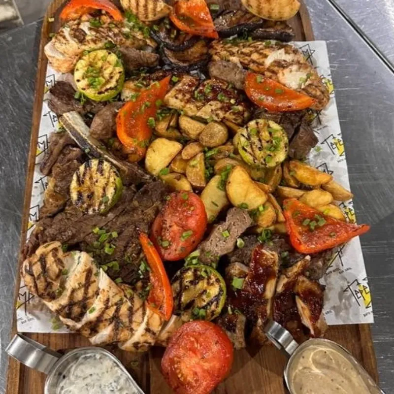 Куриная грудка 600 гр, стейк Рибай, стейк из цыпленка, говядина мякоть 400 гр, люля кебаб, цукини, болгарский перец, баклажаны, лук репчатый, помидоры, картофельные дольки, соус перечный, соус грибной, соус bbq
