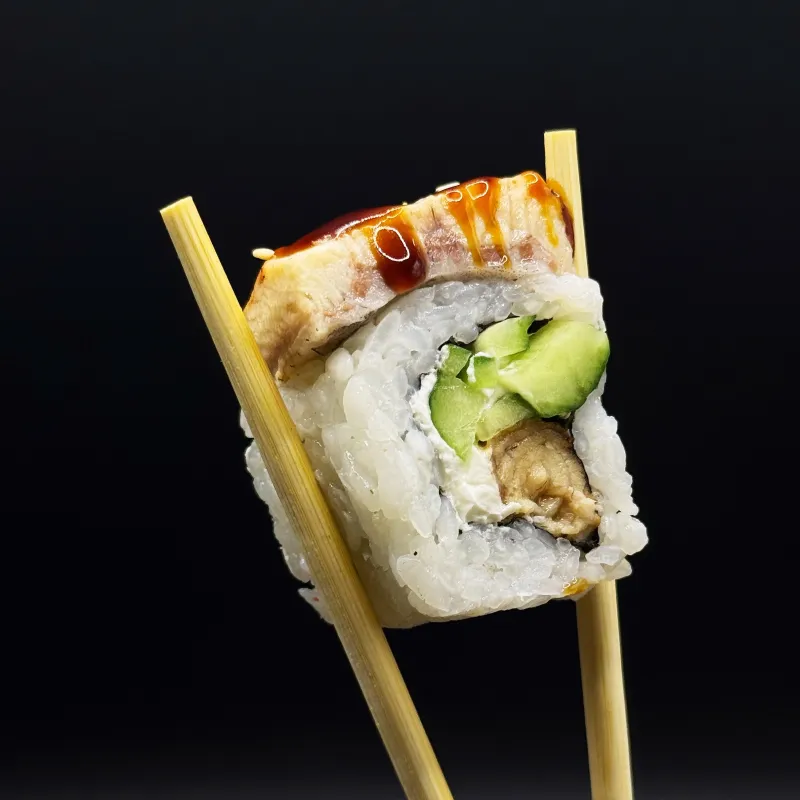 Ролл Дракон (порция 8 шт.) – эффектный ролл с копченым угрем, сливочным сыром и свежим огурцом, завернутый в нори и рис. Покрыт ароматным унаги-соусом, который подчеркивает насыщенный вкус угря. Идеальное сочетание нежности, легкой сладости и мягкого дымного аромата. Подается с соевым соусом, васаби и маринованным имбирем.