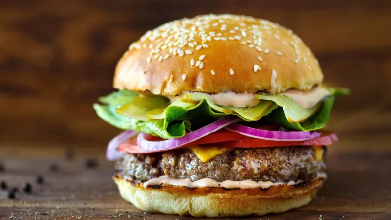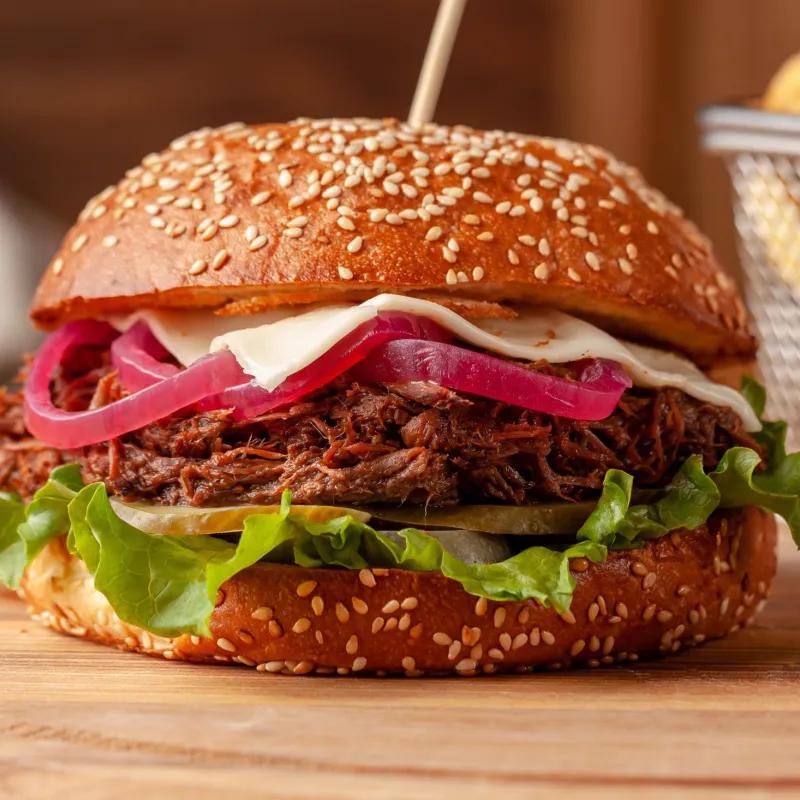 Пшеничная булочка с кунжутом, рваная говядина, помидоры свежие, огурцы солёные, лук красный, айсберг, сыр чеддер, соус сладкая горчица, майонез.