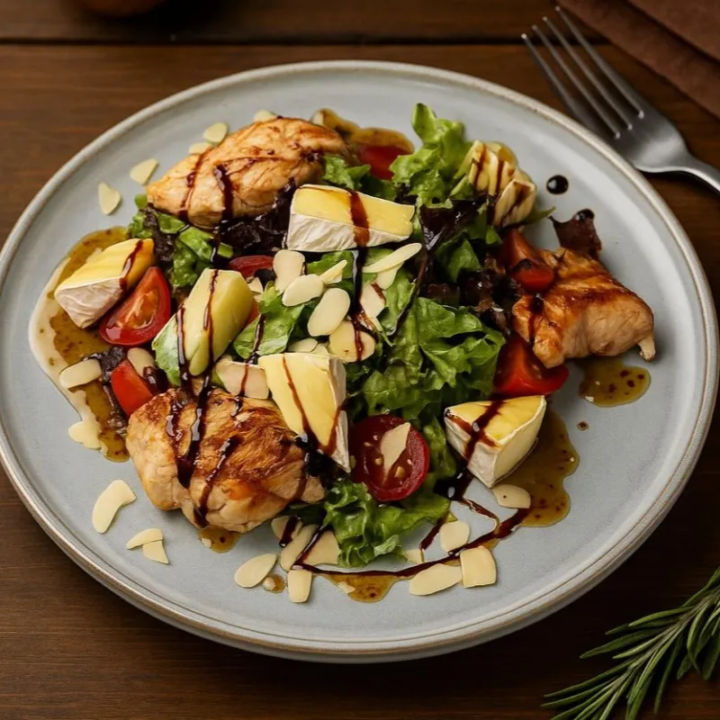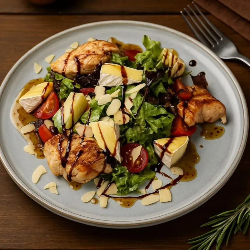 Куриное филе, сыр камамбер, микс салата, миндальные слайсы, помидорки черри, сладкая горчица