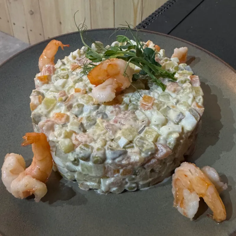 Классическое оливье с сёмгой и креветками, порция рассчитана на 3 - 4 гостя