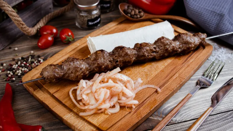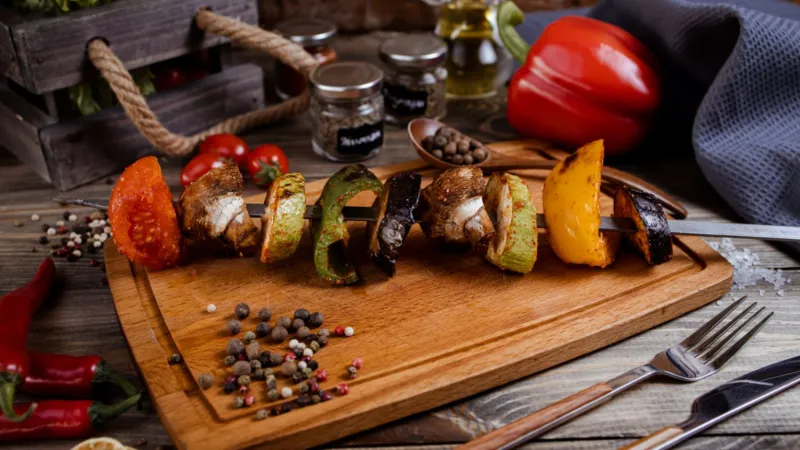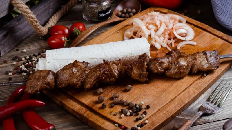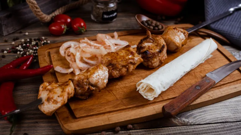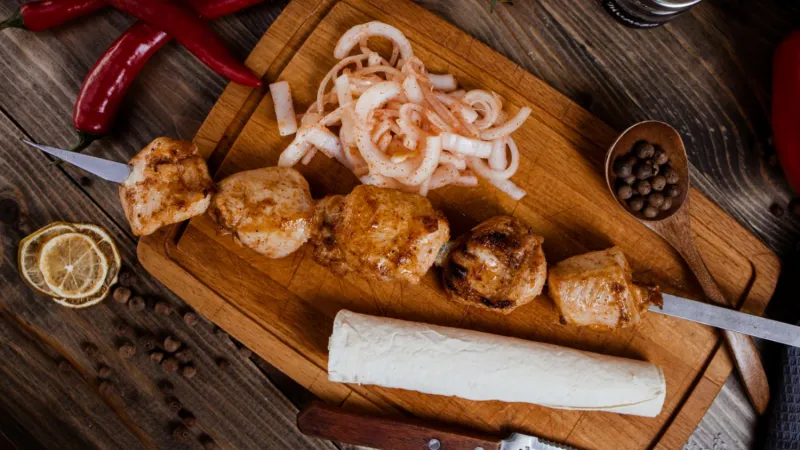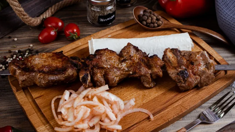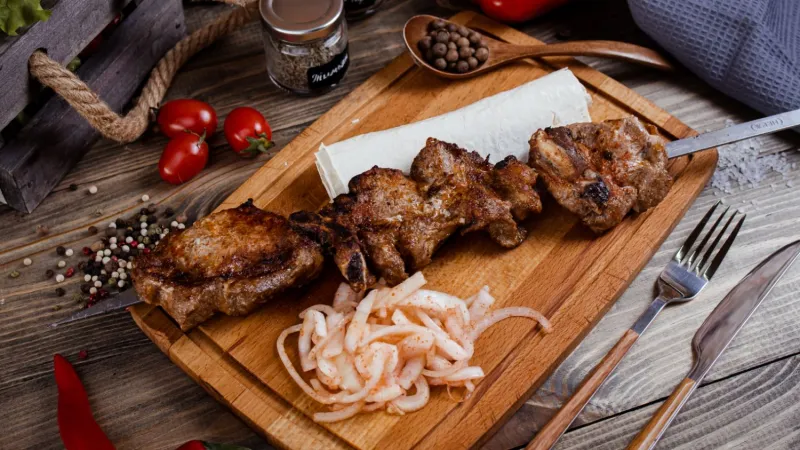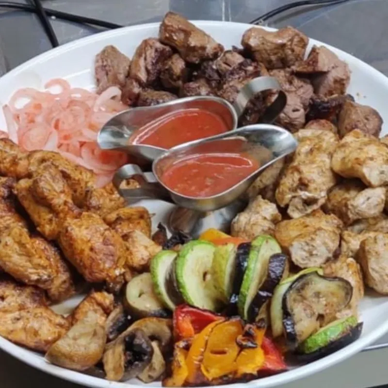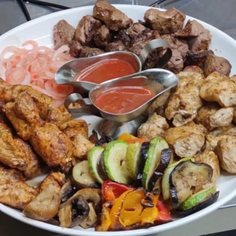 свинина, баранина, куриное филе, овощи гриль, соус шашлычный