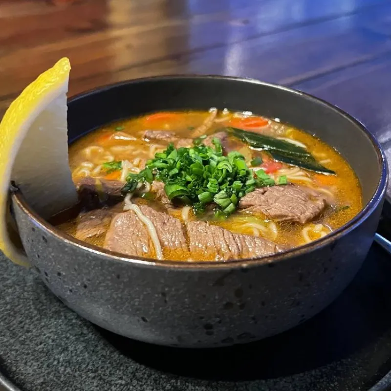 Говядина, лапша Мастер Кан, лук порей, куриный бульон, черри, лук зеленый, перчик Чили