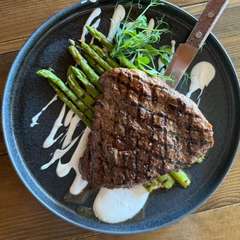 (рибай, перечный соус, микрозелень, помидоры)