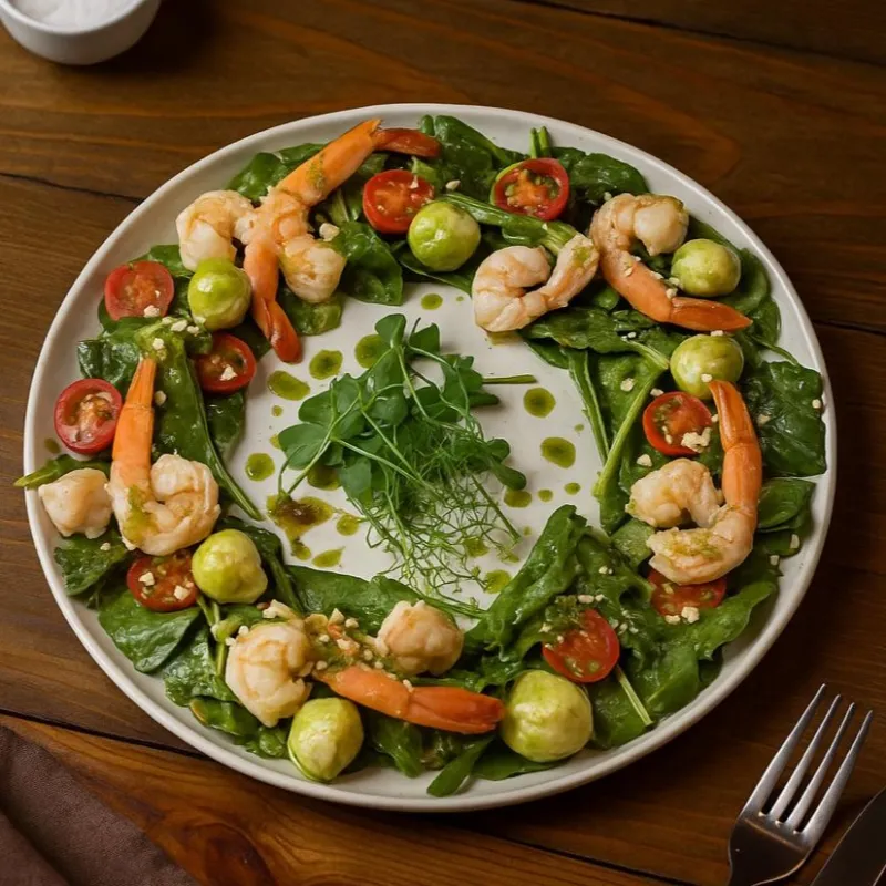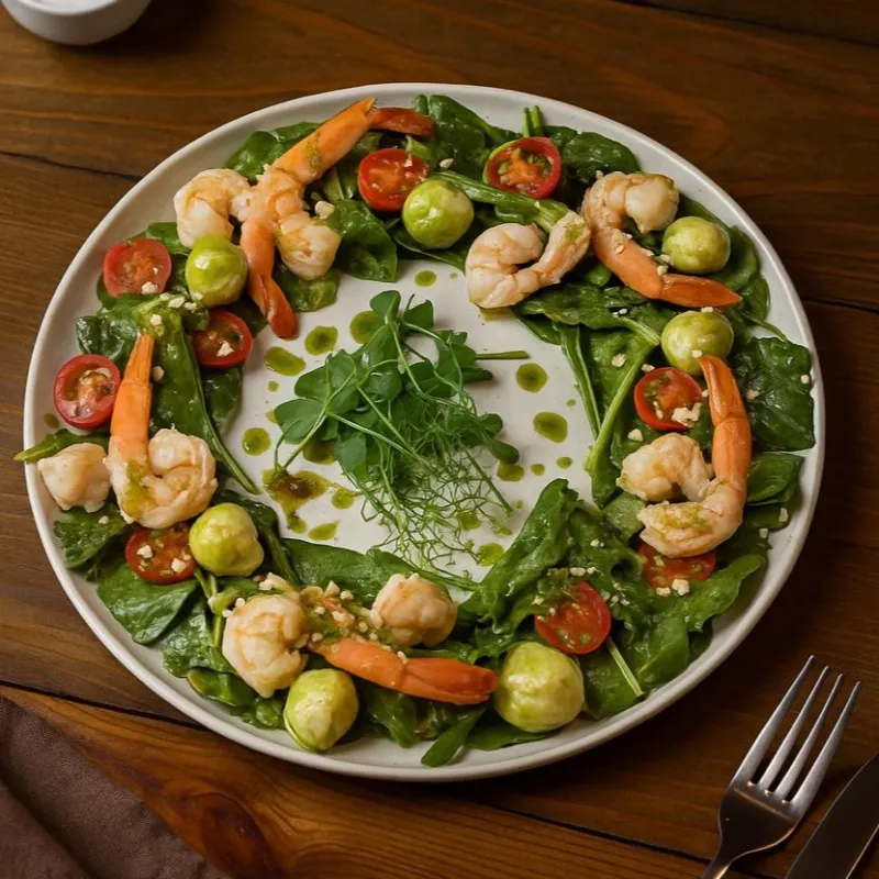 Мини моцарелла, тигровые креветки, шпинат, миндаль, соус песто