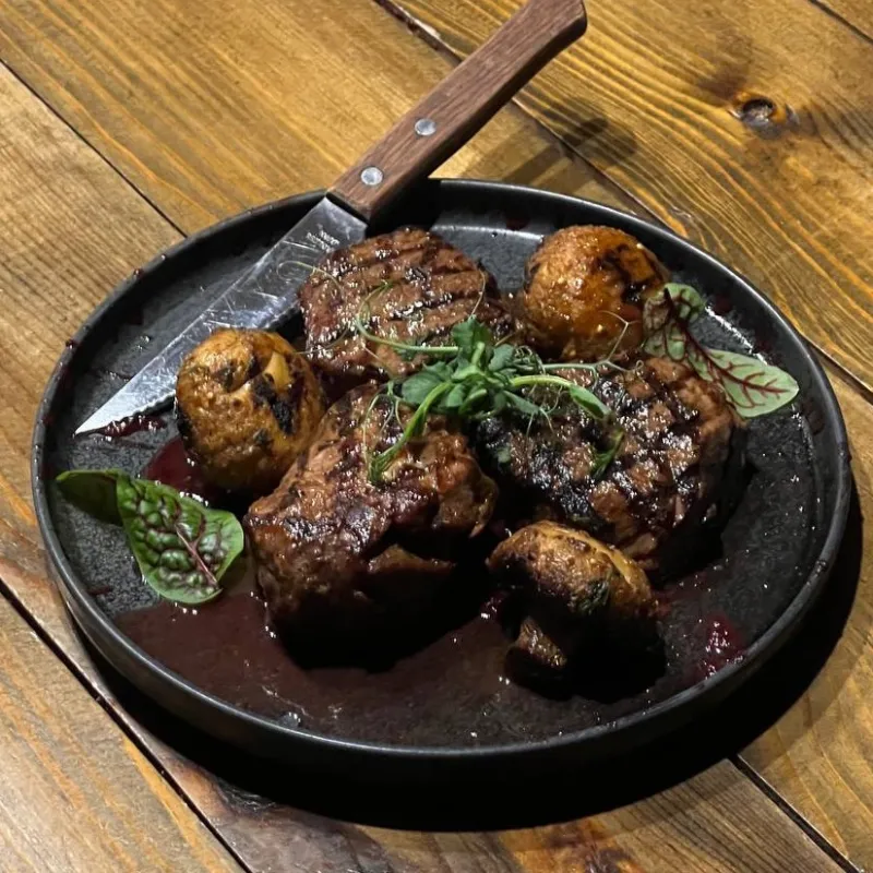 мякоть говядины, шампиньоны, вишневый соус, микрорзелень