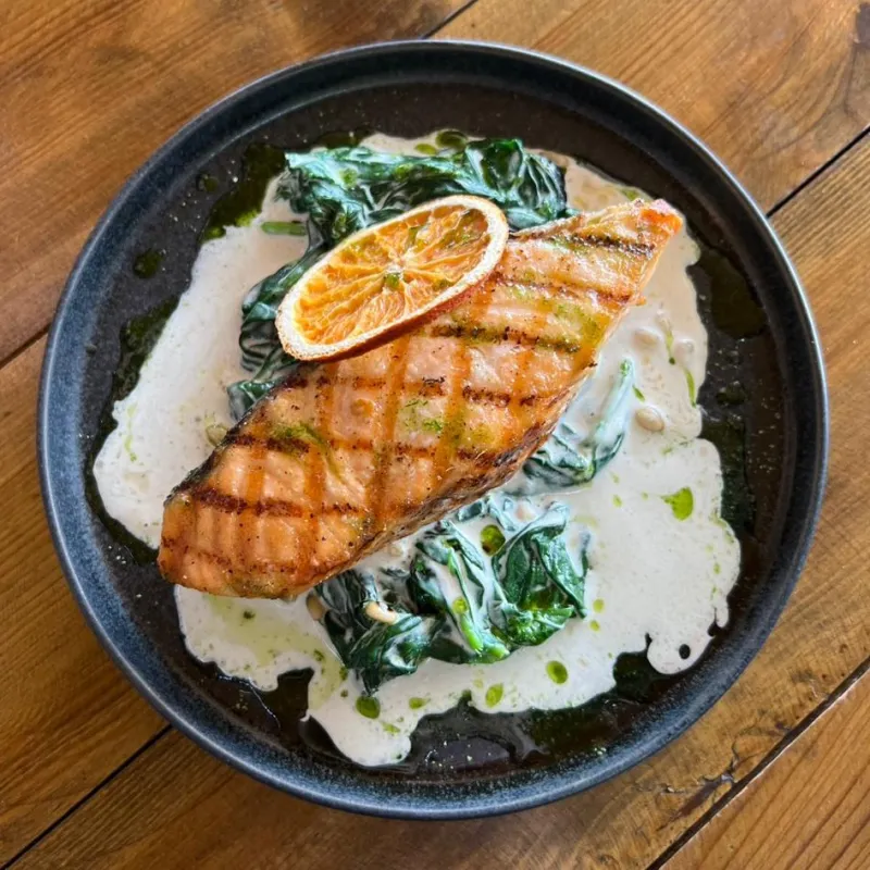 сёмга, шпинат в сливках, кедровые орехи