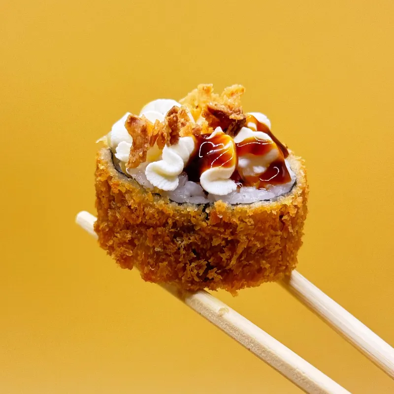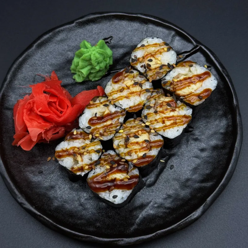 Чикен темпура (8 шт. Порция) - хрустящий темпура-ролл с копченой куриной грудкой, завернутый в нежный рис и нори. Покрыт воздушной сырной шапочкой и полит ароматным соусом унаги. Аппетитное сочетание хруста, нежности и насыщенного вкуса. Подается с соевым соусом, васаби и маринованным имбирем.
