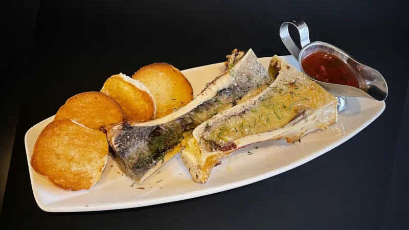 говяжьи кости, чесночное масло, булочка, зелень, соус сальса