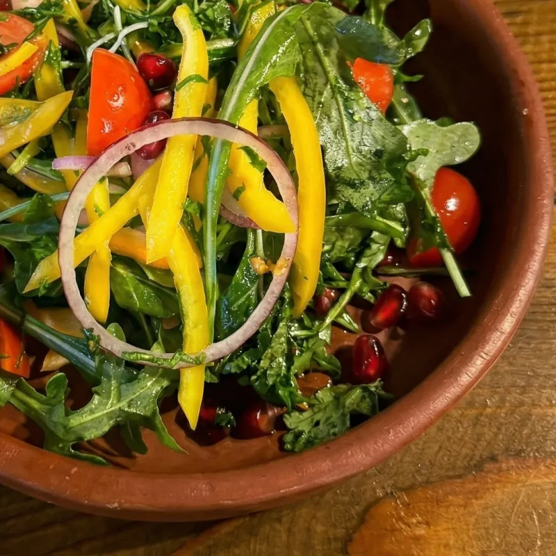 Свежая руккола, сочные зёрна граната, хрустящие овощи и лёгкая заправка с деликатной кислинкой.