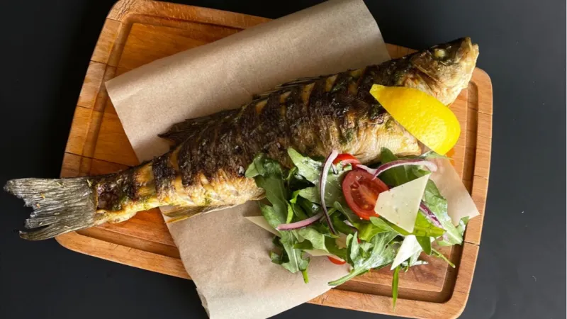 сибас, руккола, помидоры черри, пармезан, лук красный, лимон, соус песто