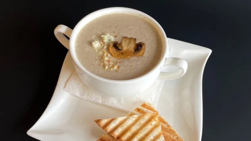 грибы шампиньоны, лук репчатый, сливки, миндальный орех, сыр дорблю