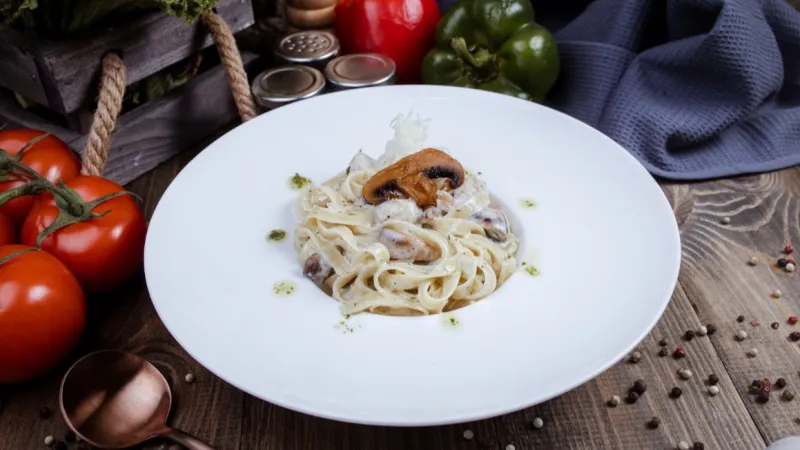 тальятелле, куриное филе, грибы шампиньоны, сливки, соус Песто, сыр пармезан.
