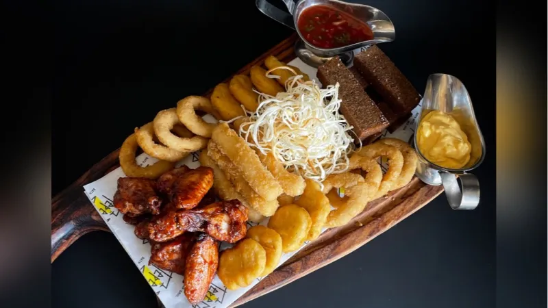 Крылья bbq, наггетсы куриные, сыр чечел, чесночный хлеб, кольца луковые, сырные палочки, соус сырный, соус сальса