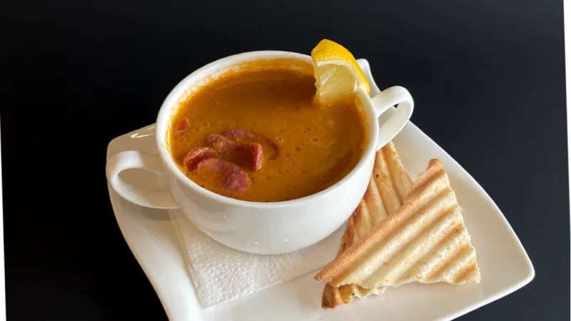 филе куриное /охотничьи колбаски, лук репчатый, морковь, томатная паста, орегано, лимон, крутоны