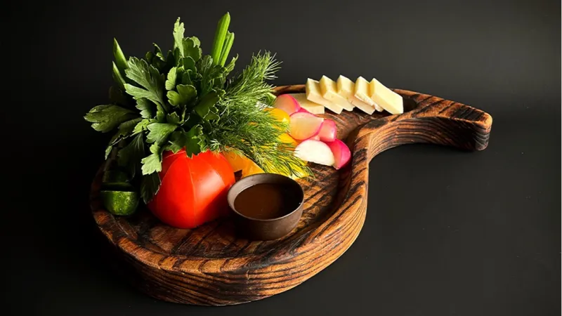 Помидоры, перец болгарский, огурцы, редис, брынза, петрушка, укроп, лук зелёный, лолло-россо