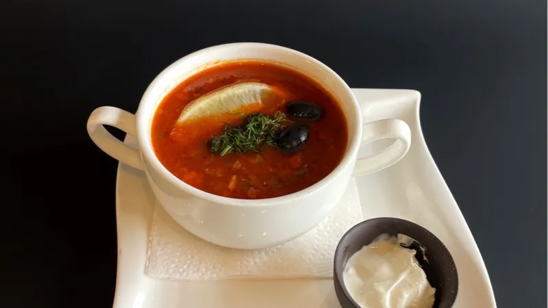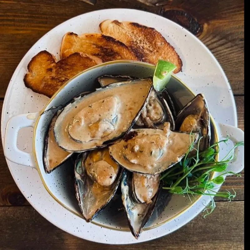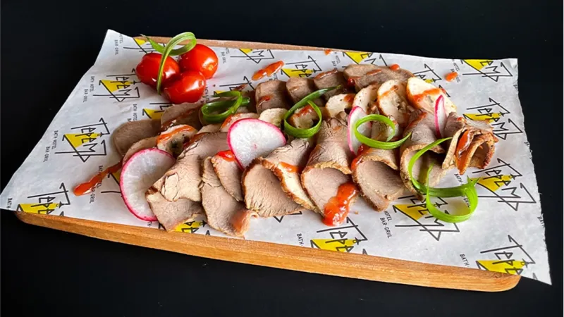 говяжий язык, сыр салакис, помидорки черри, сливочно-горчичный соус.