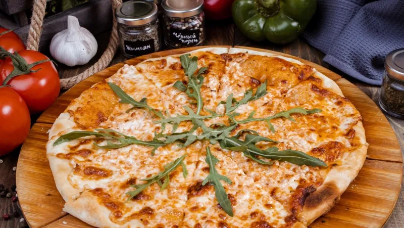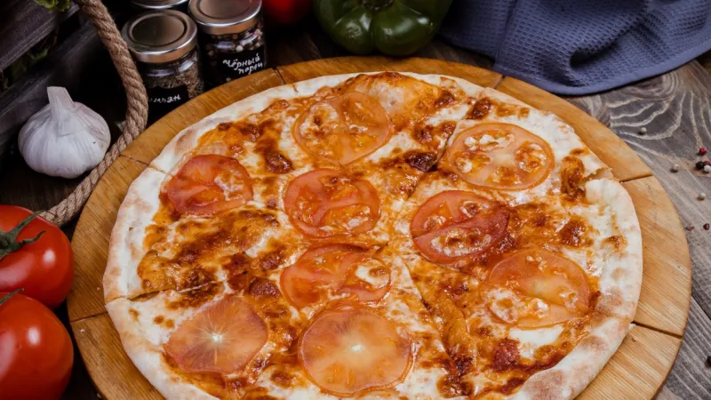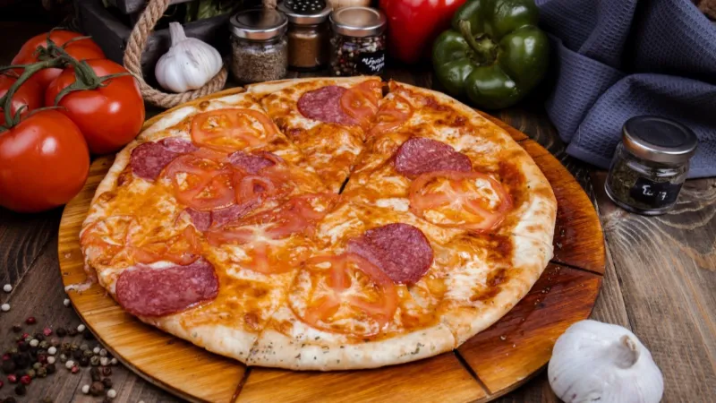 Колбаса салями, помидоры свежие, сыр Моцарелла, пицца соус, масло оливковое.