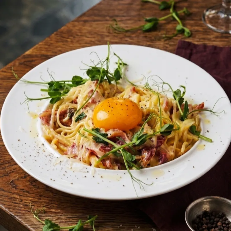 Бекон, желток, сливки, микро зелень