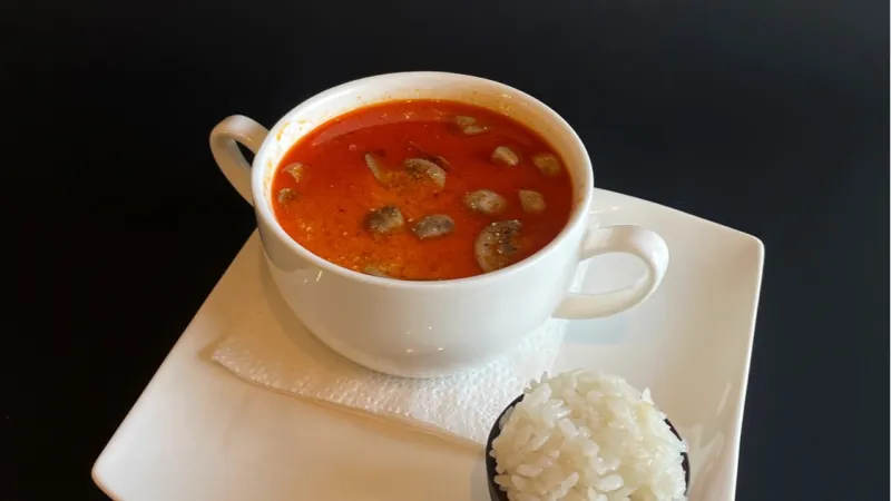 креветки тигровые, грибы шампиньоны, мидии, кокосовое молоко, имбирь, паста том ям, лимонный сок