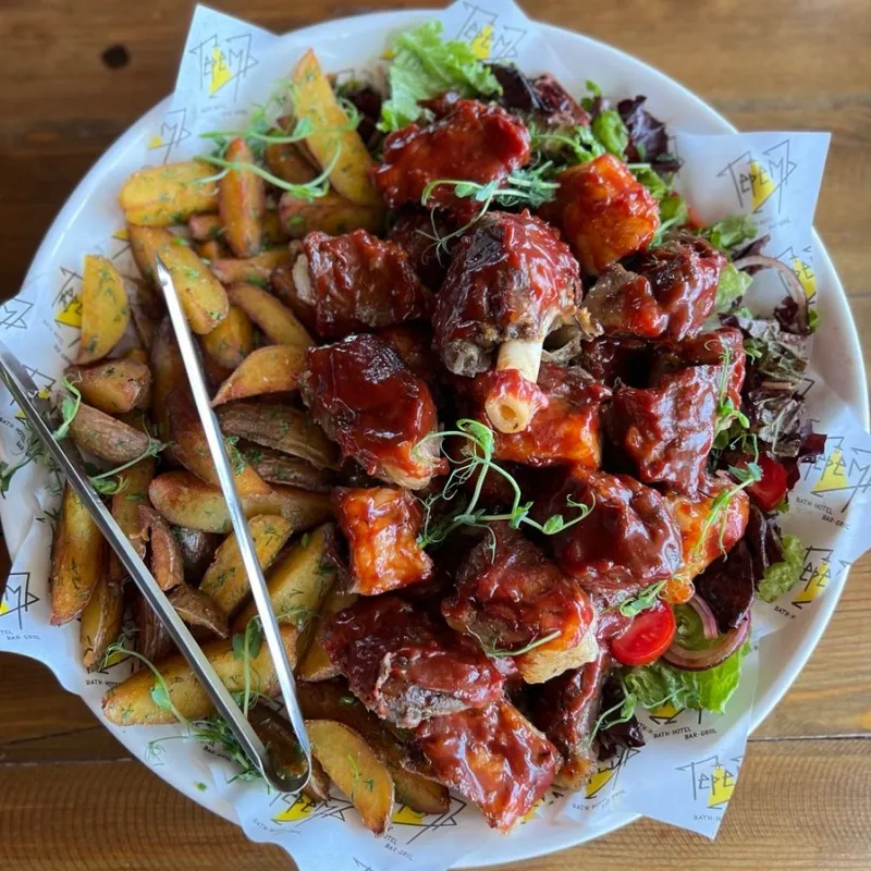 ребра, картофельные дольки, помидоры, лук красный, лист салата, лола росса, соус Блю Чиз, соус bbq