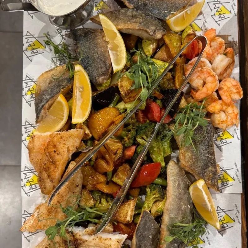 тигровые креветки, горбуша, филе судака, филе скумбрии, овощи в специях, фасоль стручковая, лимон, соус сливочный, соус унаги