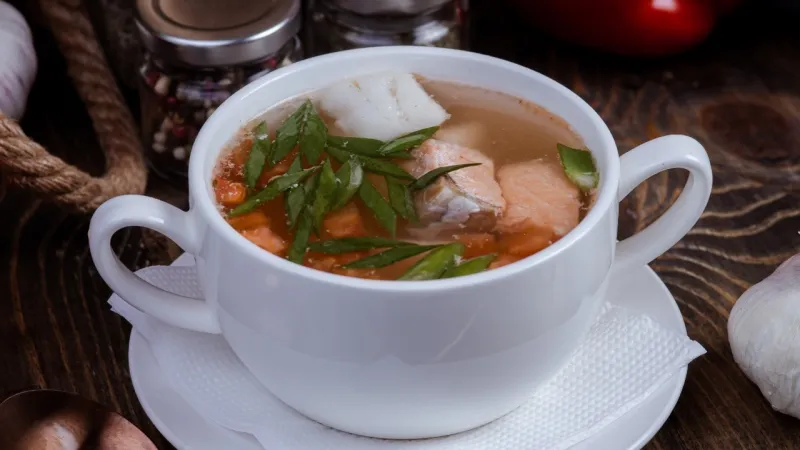 сёмга, филе судака, бульон рыбный , помидоры, картофель, лук репчатый, лук зелёный