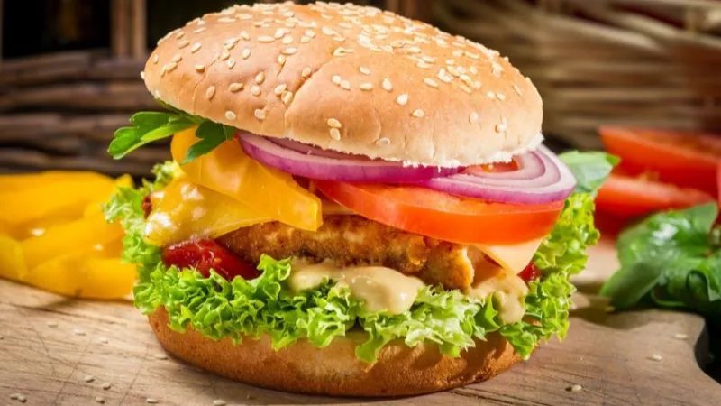 Пшеничная булочка с кунжутом, куриная котлета, помидоры свежие, огурцы солёные, лук красный, айсберг, сыр чеддер, соус сладкая горчица, майонез.