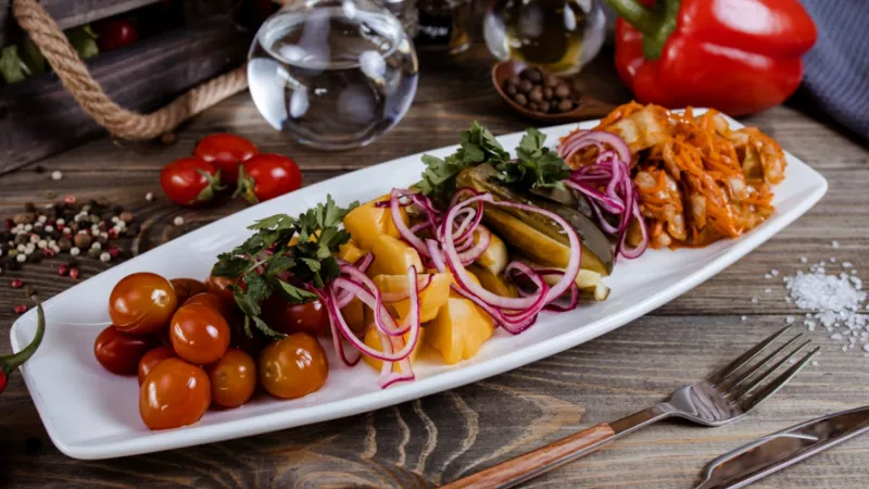 Солёные огурчики, черри, острая капуста, патиссоны, красный лук