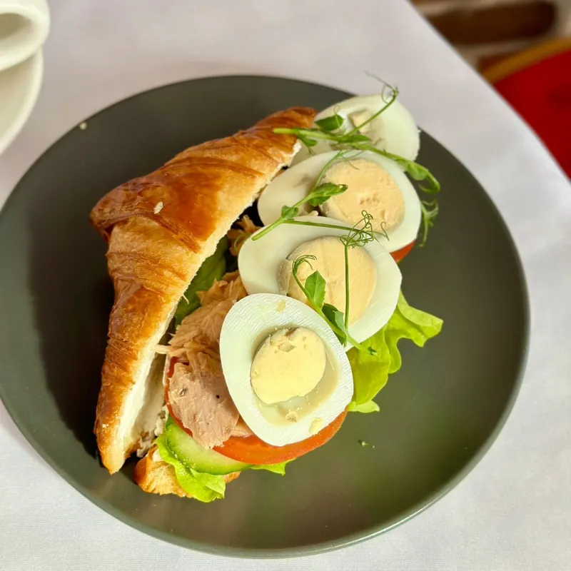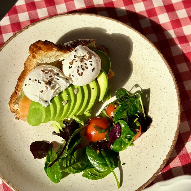 Французский круассан, слабосоленый лосось, яйцо пашот, авокадо, микс салата, крем чиз