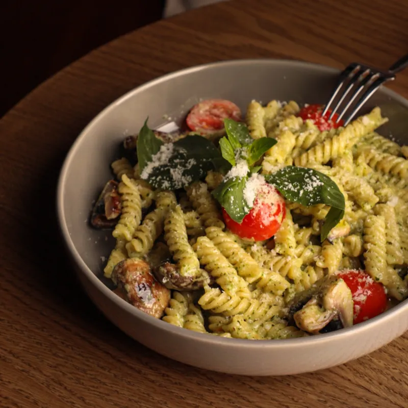Спиральная паста в ароматном соусе из базилика, сыра и оливкового масла.