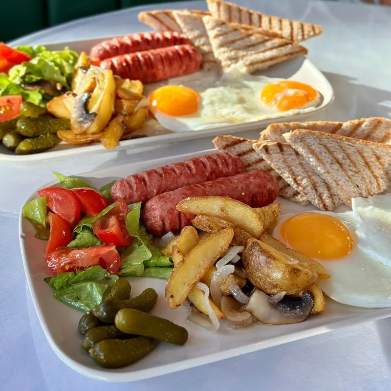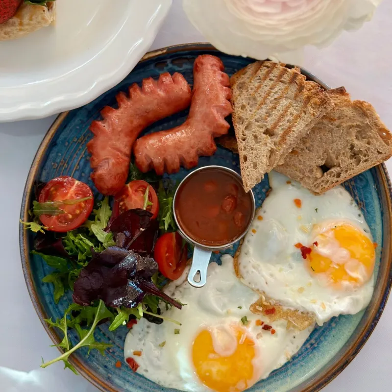 Говяжьи сосиски, фасоль в томате, яйца, сельский тост