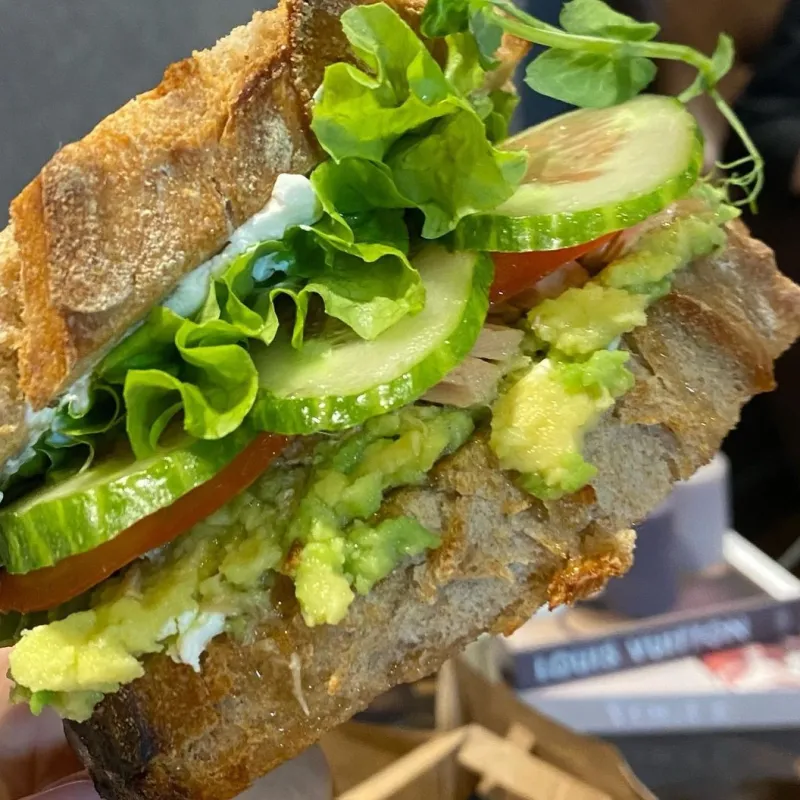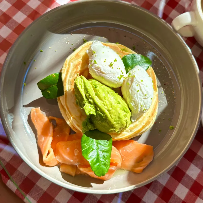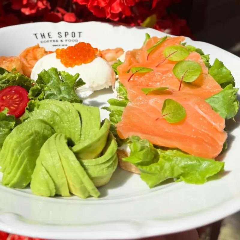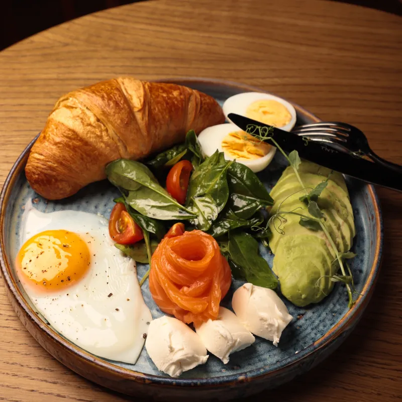 Французский круассан, 2 яйца, авокадо, салат, творожный сыр, на выбор: - лосось; - куриная грудка на гриле; - бекон. Дополнительно: халапеньо