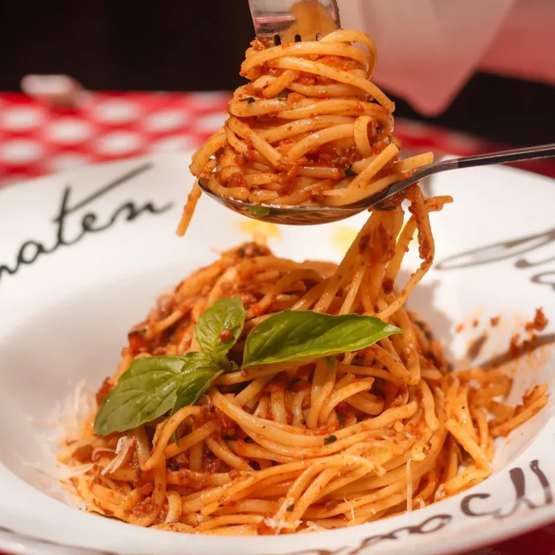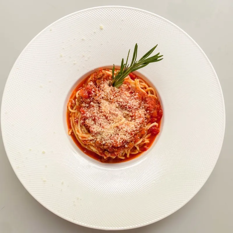 Паста с насыщенным мясным соусом из томатов и специй.