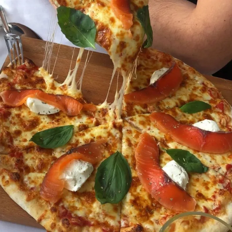 Творожный сыр, лосось собственного посола, итальянский сыр моцарелла, свежий базилик, фирменный соус