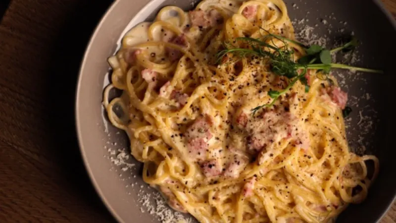 Паста в сливочно-яичном соусе с говяжим беконом и сыром.