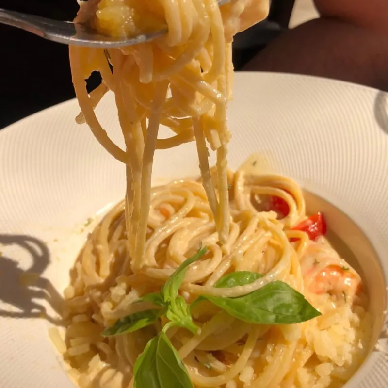 Нежная паста в ароматном соусе с сочными креветками и свежими травами.