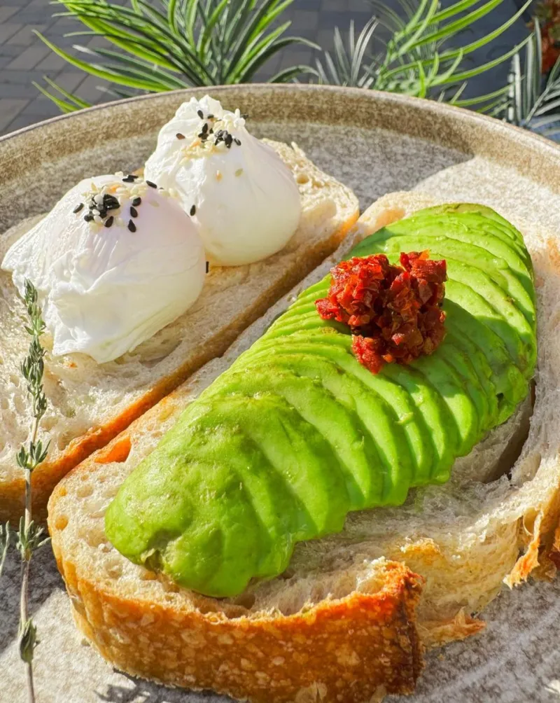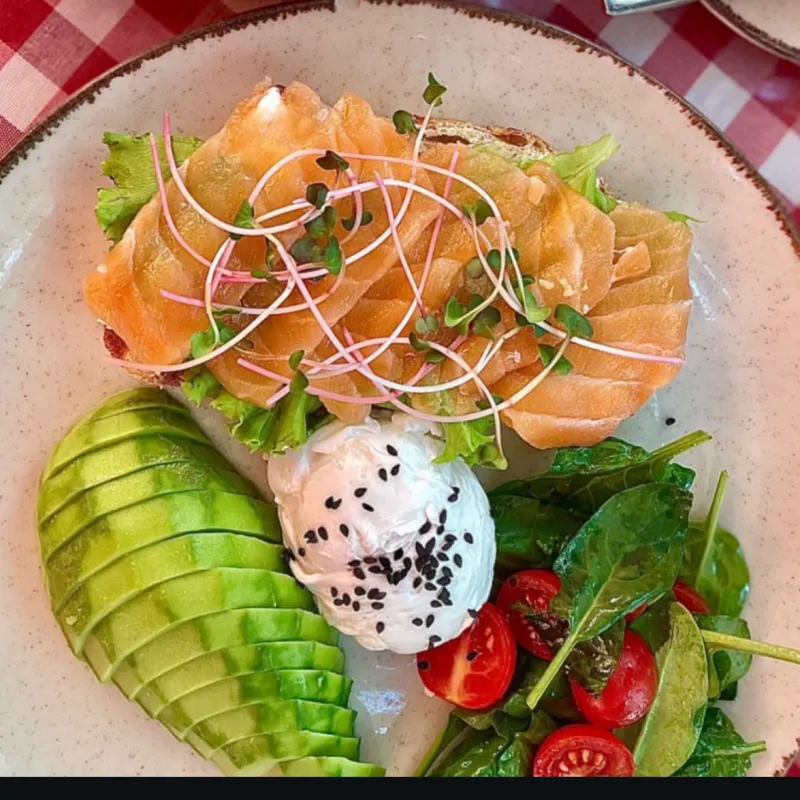 Завтрак на цельнозерновом хлебе с лососем, авокадо и яйцом пашот — полезный и питательный старт дня.
