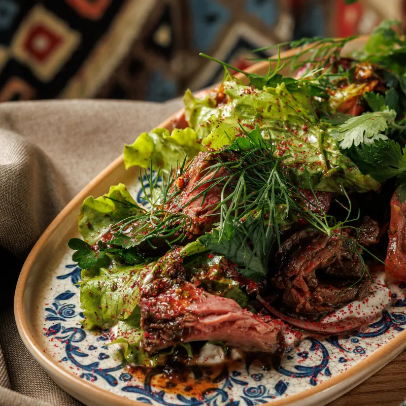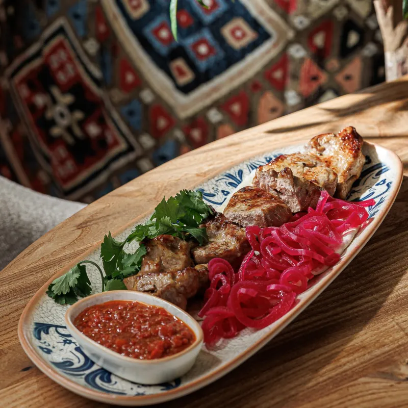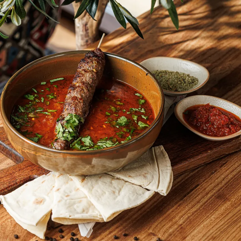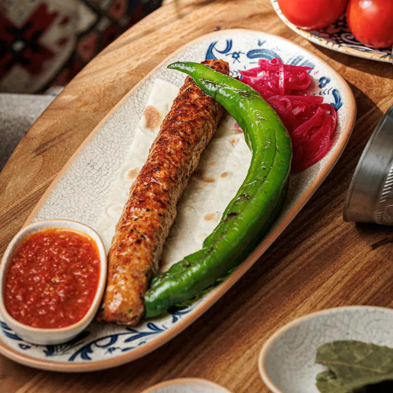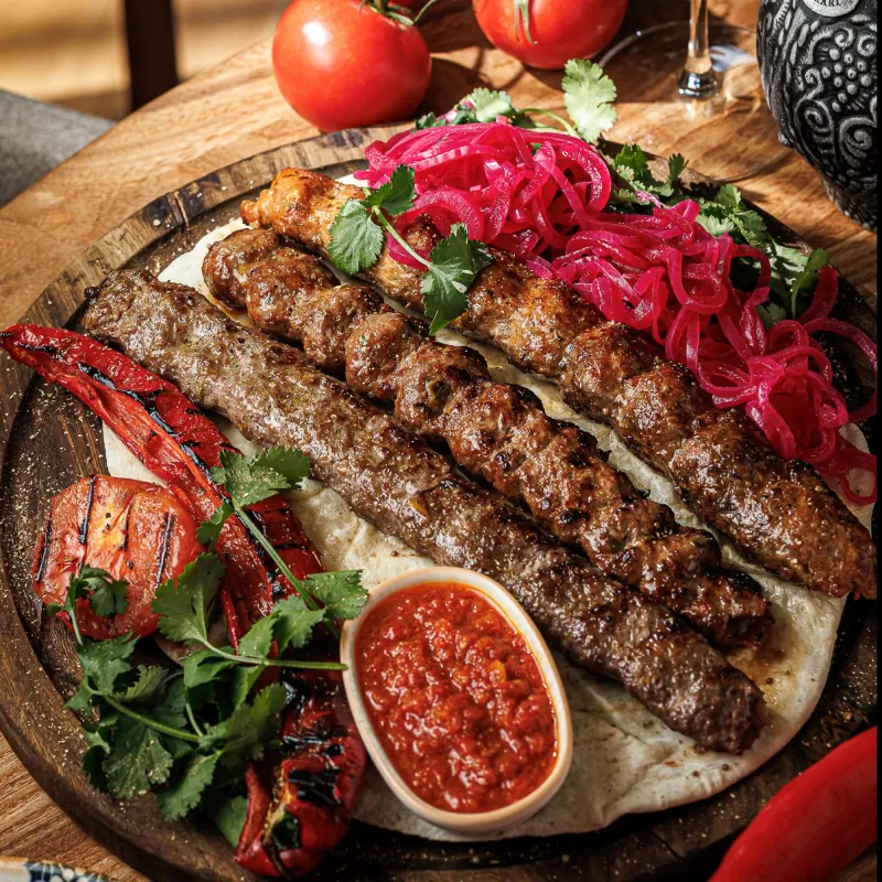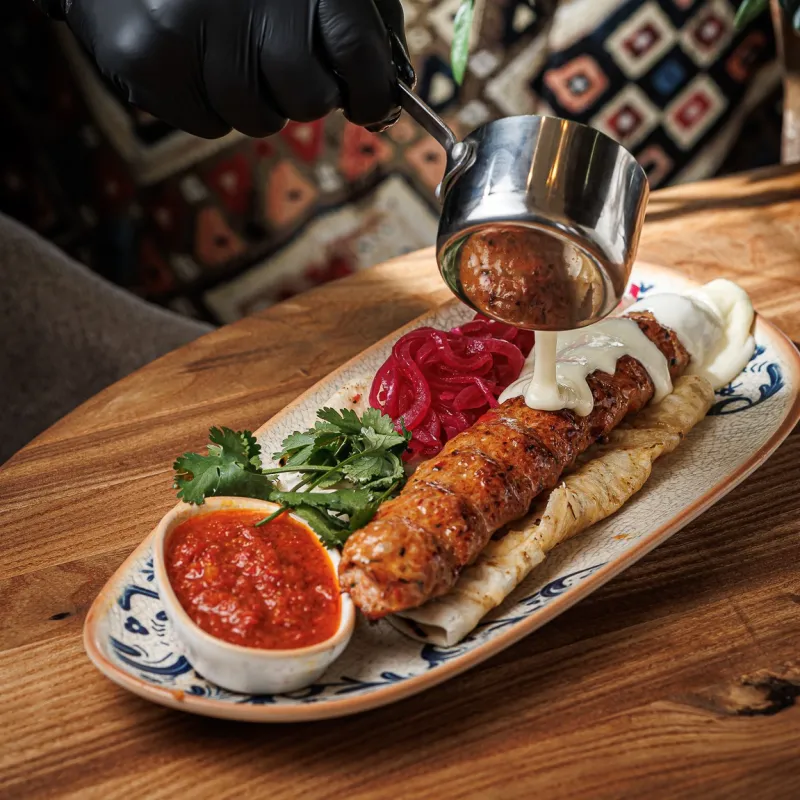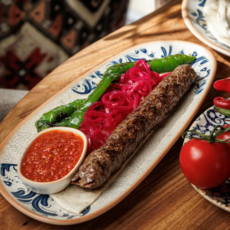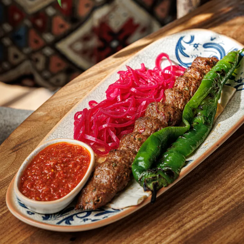 адана кебаб / кебаб адана из цыпленка / кебаб из мраморной говядины / дзадзики / харисса
